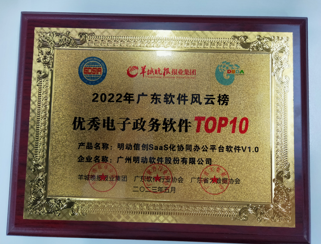 《明動SaaS化協(xié)同辦公平臺軟件V1.0》以技術(shù)創(chuàng)新能力以及優(yōu)異的產(chǎn)品應(yīng)用成果,分別獲評“2022年廣東軟件風(fēng)云榜電子政務(wù)軟件TOP10”、“2022年廣東軟件風(fēng)云榜新技術(shù)應(yīng)用最受歡迎產(chǎn)品TOP10”。