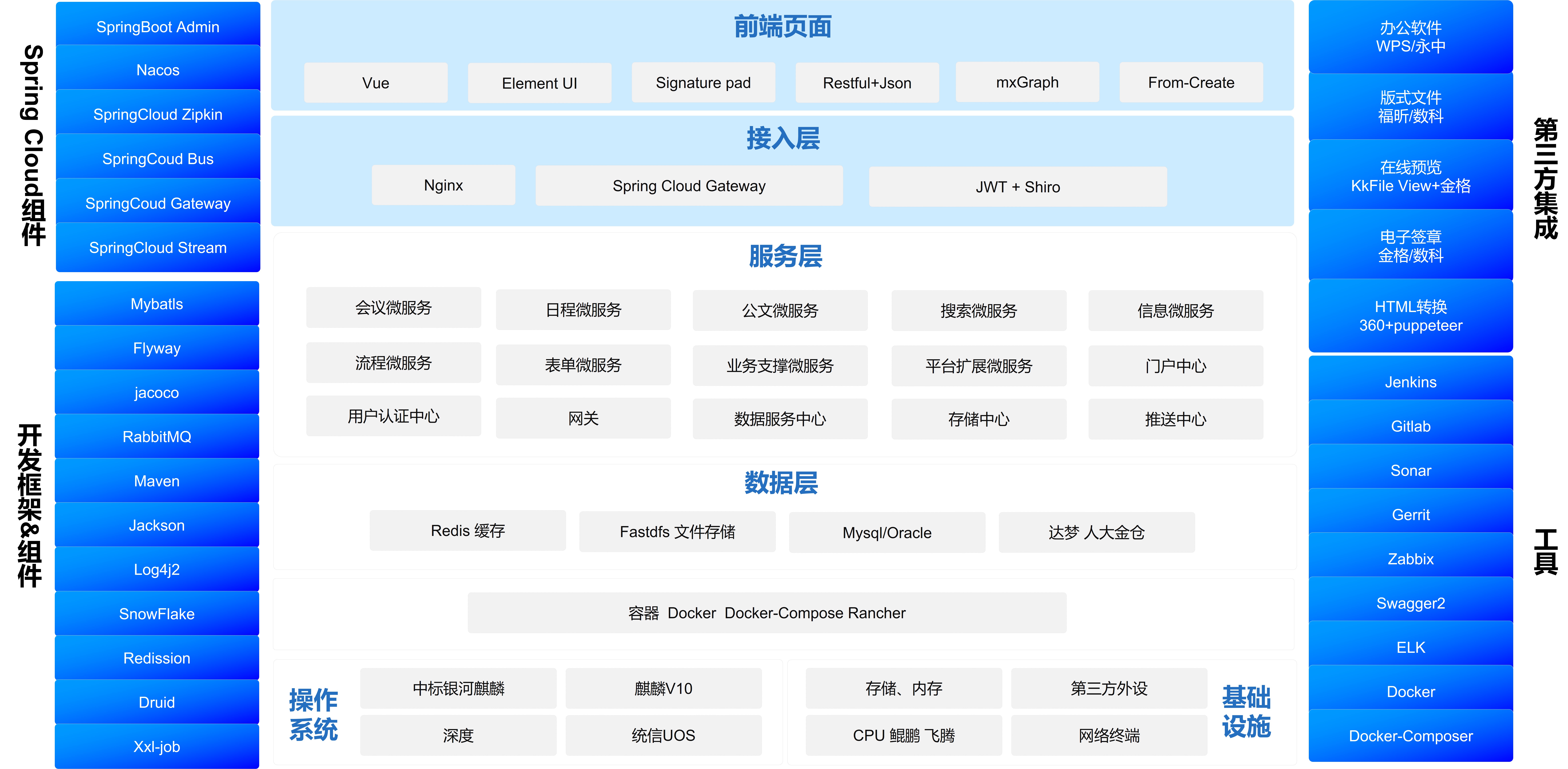 以SaaS化應(yīng)用為入口,實現(xiàn)各個單位可以通過租戶的方式完成單位的協(xié)同辦公平臺建設(shè)和使用。從底層架構(gòu)設(shè)計完成多個服務(wù)與應(yīng)用的設(shè)計,實現(xiàn)以平臺化的方式來滿足現(xiàn)有業(yè)務(wù)和未來業(yè)務(wù)的擴展,全面適配國產(chǎn)化軟硬件環(huán)境。