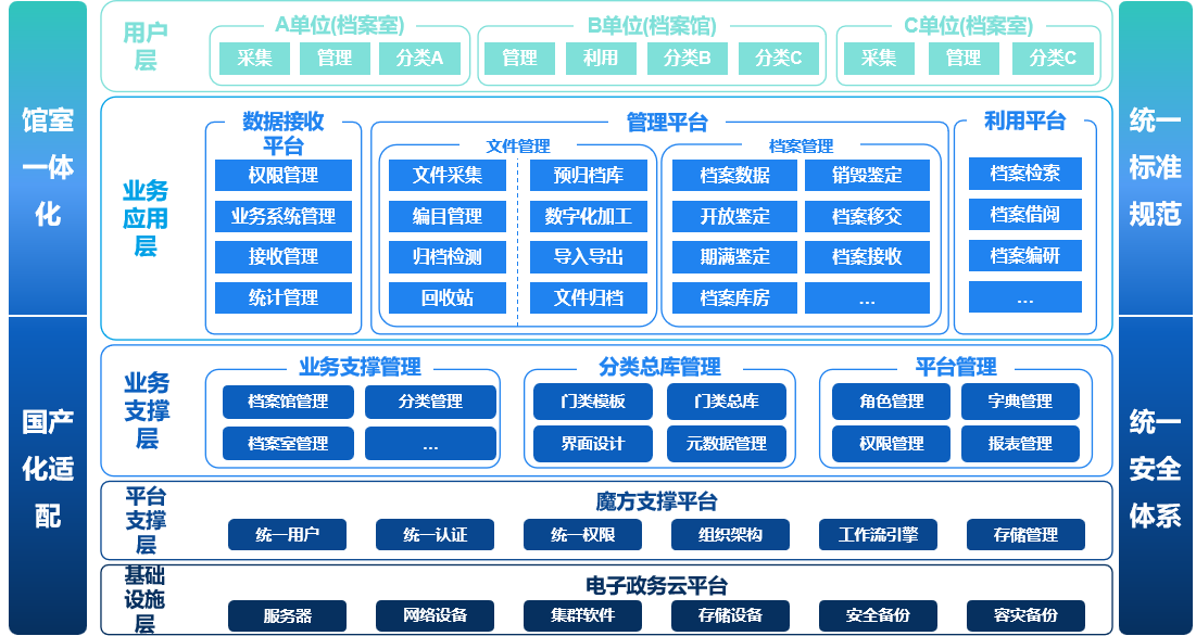 明動云檔案一體化平臺基于國產(chǎn)/非國產(chǎn)環(huán)境,通過魔方支撐平臺、業(yè)務(wù)支撐層實現(xiàn)業(yè)務(wù)規(guī)則的靈活配置,平臺基于“一庫三平臺”的理念進行設(shè)計,涵蓋文件管理及檔案管理,打通全面無紙化辦公的最后“一公里”,實現(xiàn)電子文件、電子檔案生命周期全覆蓋,并提供檔案數(shù)字資源跨區(qū)域、跨部門共享利用服務(wù)。